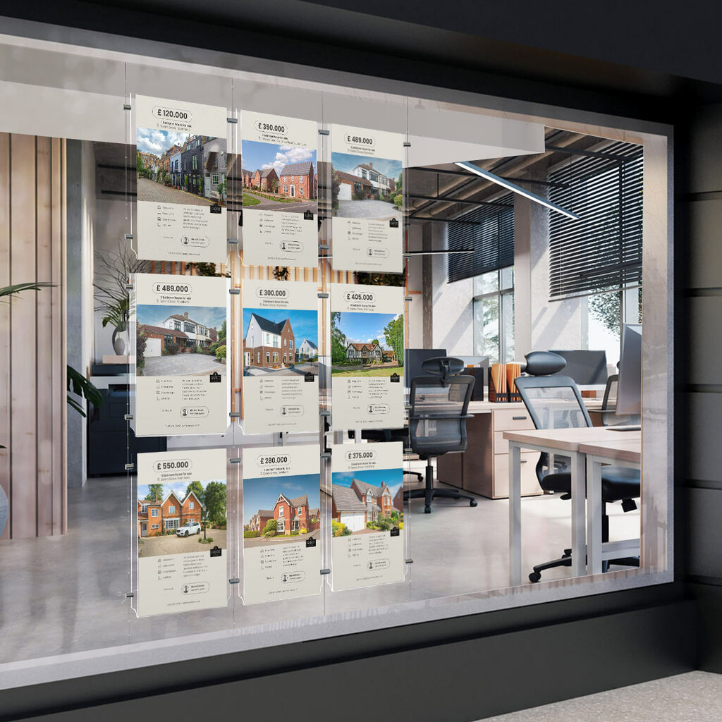 Estate agents need to be able to display multiple property listings in a way that is professional, attractive and accessible. Hanging pockets, used in conjunction with wire kits, provide an elegant solution.